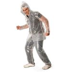 Костюм — брюки и куртка с капюшоном — из самой настоящей воздушно-пузырьковой пленки, в народе "пупырки". Прикольная прозрачная одежда-антидепрессант. Выручает в дождь, веселит на вечеринке, успокаивает во время стресса. Размер — универсальный.