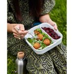 • общее отделение с крышкой на защелках, внутри отдельный контейнер и соусник с плотно прилегающими силиконовыми крышками;