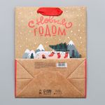 Удобный пакет среднего размера из плотной крафтовой бумаги, с цветной картинкой и поздравлениями с Новым годом с каждой стороны. Боковые стенки снаружи красные. Ручки из широкой красной ленты, очень ярко и празднично.