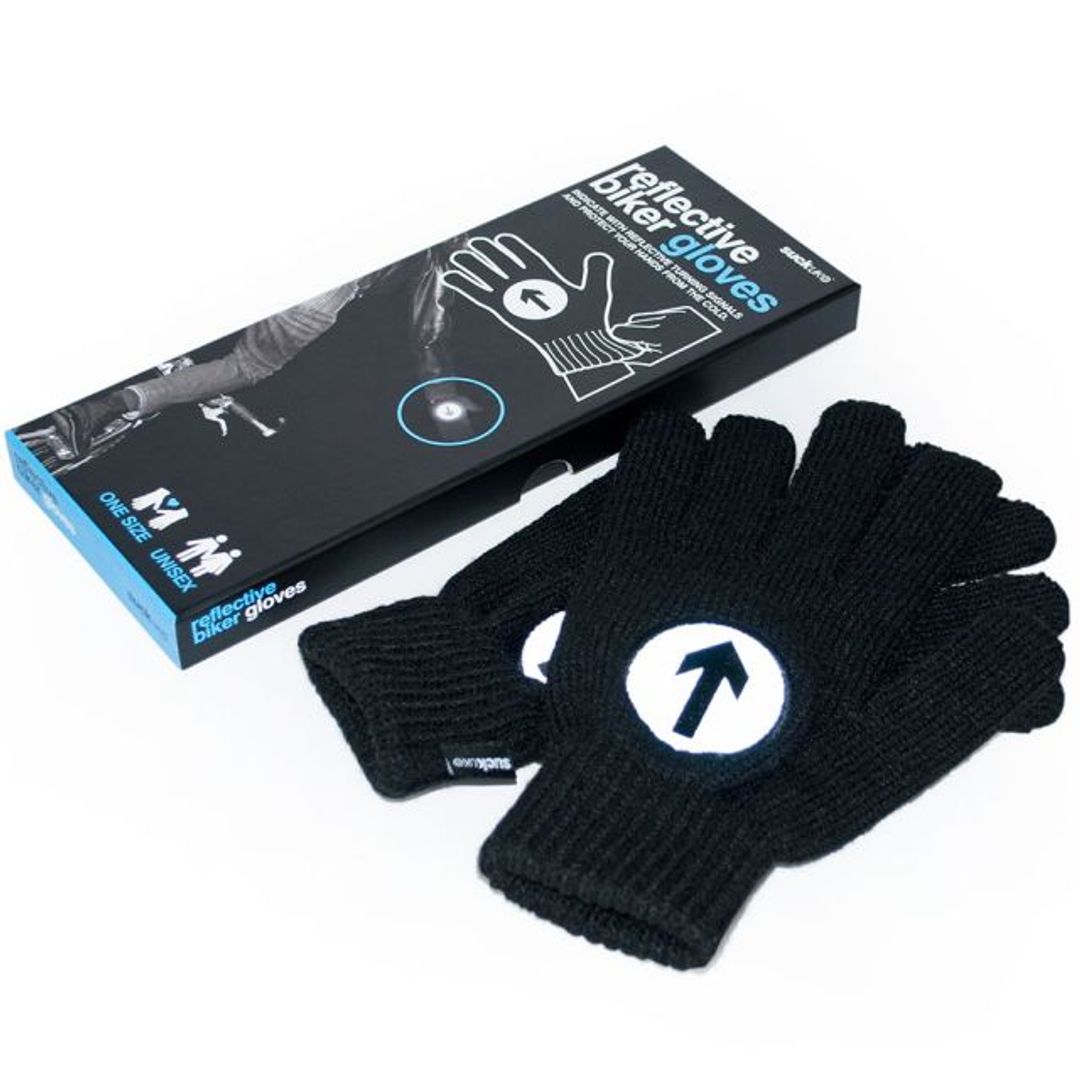 Поэтому и существуют Перчатки для велосипедистов со светоотражающими знаками. Это обычные черные перчатки, на тыльной стороне которых изображена стрелка в круге. Ничего особенного. Но в темноте материал, из которого изготовлен круг-нашивка, отражает свет фар и фонарей. Известное свойство этого материала, часто применяемое для одежды рабочих, ведущих ремонт дорог, и в прочих подобных случаях.