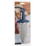 Рабочая часть терки из нержавеющей стали, рукоять меча — пластиковая, синего цвета. Упакована она в аккуратный блистер на картонной подложке, готова к вручению любителю сыра, пасты, пиццы, приключений и рыцарской романтики. Кстати, такую забавную и вместе с тем удобную форму терки придумали в Израиле, в компании Peleg Design. Обратите внимание еще на их же Отделитель желтка от белка Yolkfish, правда, очаровательная задумка?